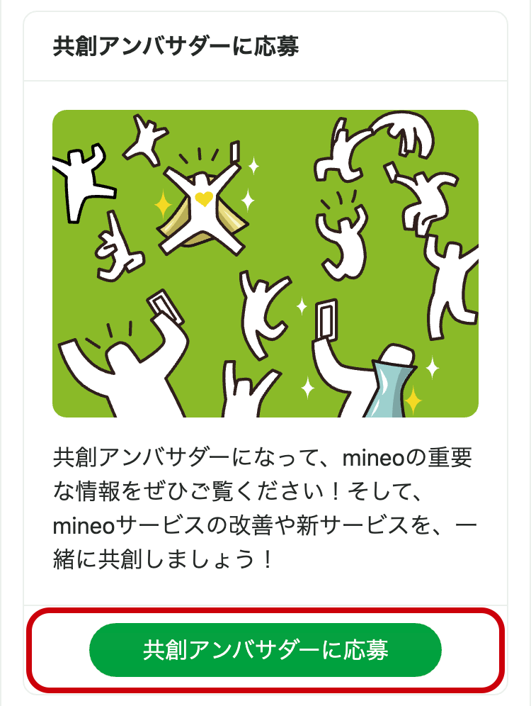 「共創アンバサダー」とは、事業戦略やプロモーション、ネットワークなどmineoに関する重要な情報を共創アンバサダーの方限定で公開し、サービス改善などの新しいアイデアに繋げるための制度です。