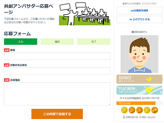マイページのメニュー、または各種リンクから「共創アンバサダー」ページへとお進みください。