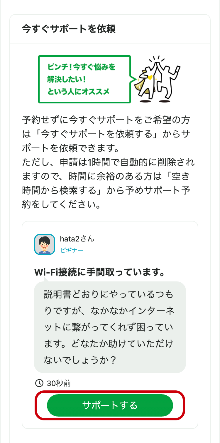 「今すぐサポートを依頼する」と「空き時間から探す」でサポート受付方法が異なります。