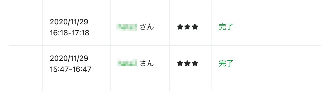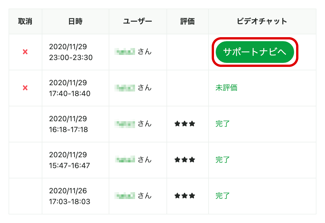 ビデオチャット終了後、利用者によるユーザー評価が行われます。その内容はビデオチャットごとにサポートナビで確認することができます。