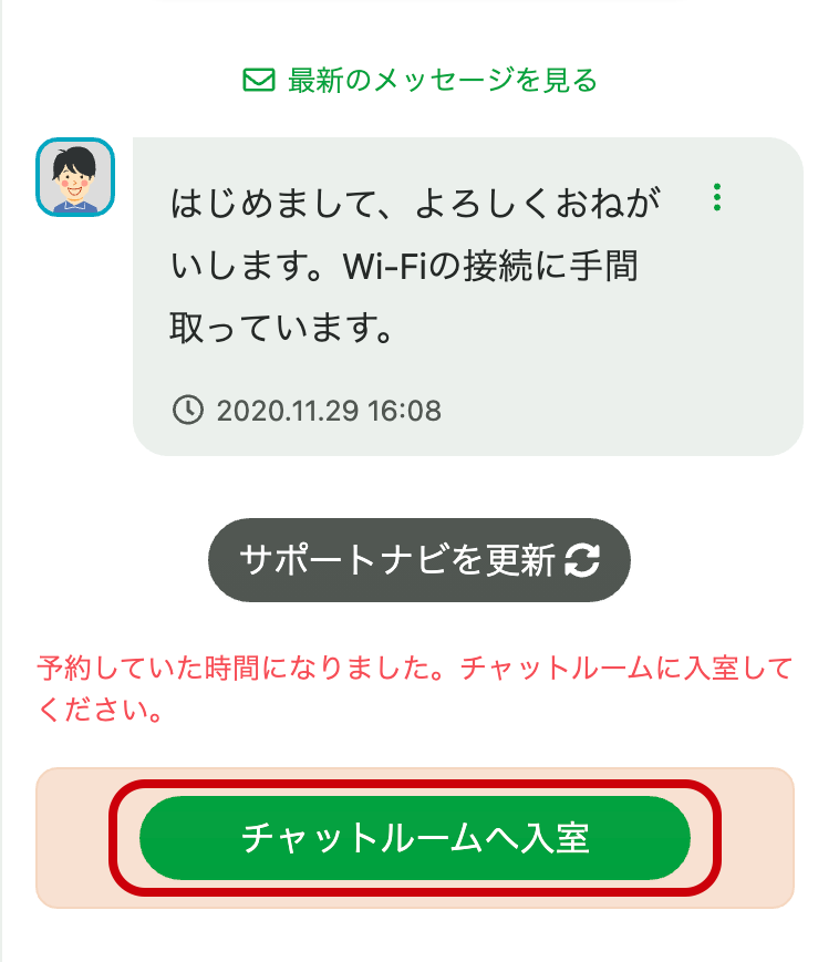予約日時になると、サポートナビ内の表示が切り替わり、チャットルームへ入室できるようになります。