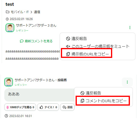 投稿コンテンツ、コメントのURLをコピーする機能をハンバーガーボタン「三」に追加いたします。