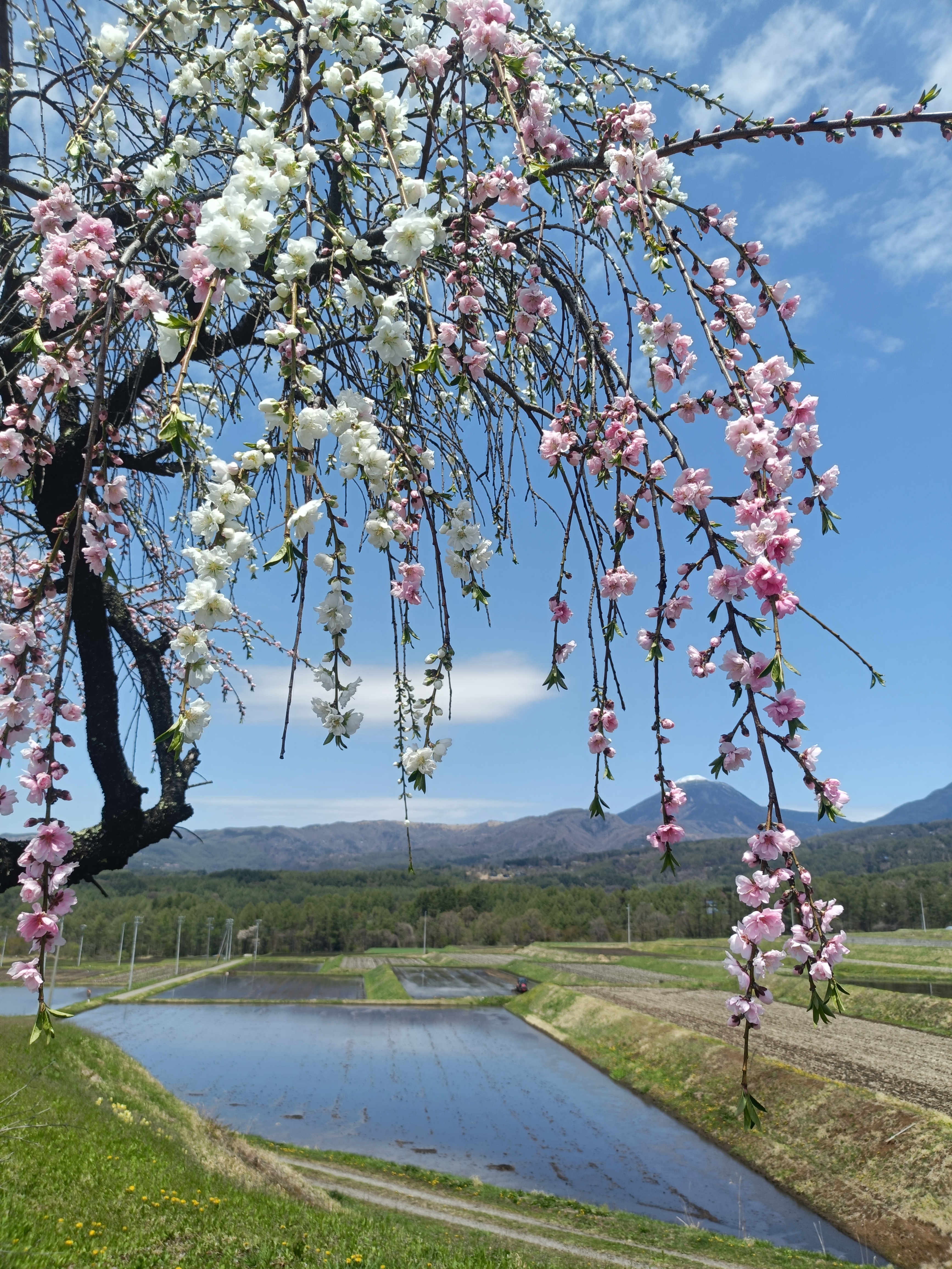 5/3白と薄ピンクの花桃が咲き出しました。🌸🌸🌸田圃では御田植の準備で代かき始めてますね。2日の雨は山では雪だった様です😅