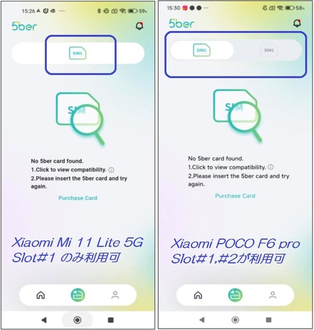 EIOTCLUBを除く いずれの「物理eSIMカード」管理アプリの場合にもどのスロットが利用可能なのか確認することが出来、「Xiaomi Mi 11 Lite 5G(物理スロットx2)」では「スロット#1:利用可、スロット#2:利用不可」となり、「Xiaomi POCO F6 pro(物理スロットx2)」では「スロット#1:利用可、スロット#2:利用可」と表示されています。