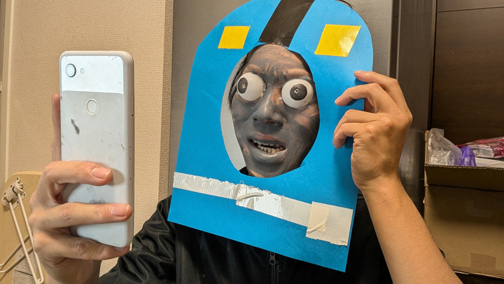 もう一度きかんしゃのコスプレ。寝起き直後にきかんしゃのコスプレをするなんて、強火の鉄オタでもやらないと思う。