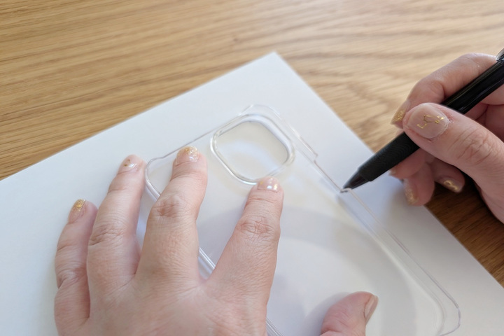 型紙用のコピー用紙などに、手持ちのスマホケースをあてて形を写しとります。
