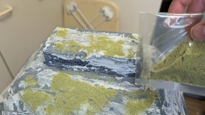 100均で売ってたジオラマ用の草を表面に散布。“苔感(こけかん)”を出します。苔感、口ずさみたくなる語感の良さ。