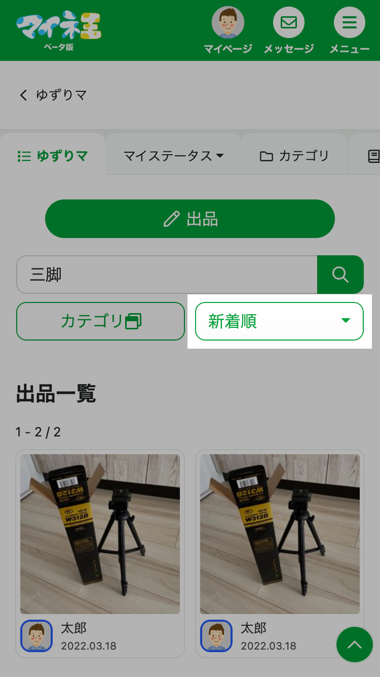 「新着順」と表示されているエリアをタップすると、出品されているアイテムの並び順を変更することができます。