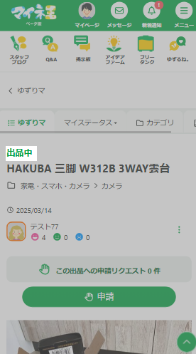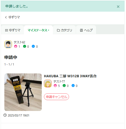 アイテムの詳細を確認し、ゆずってほしい場合は「申請」ボタンをタップしてください。