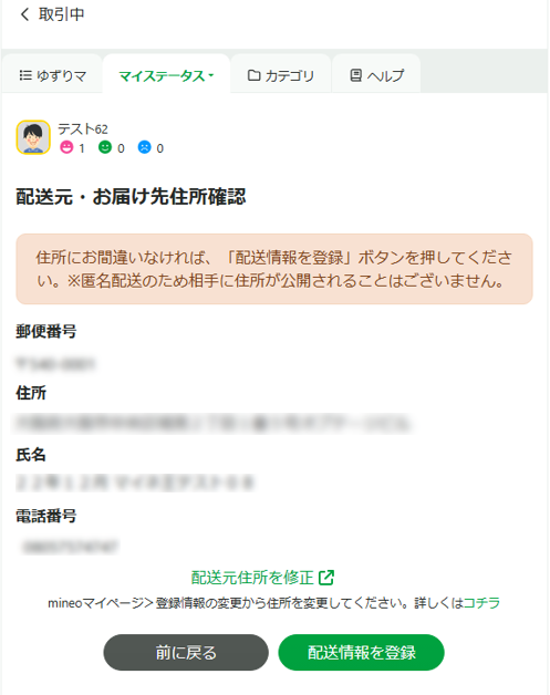 mineo回線に登録の住所を確認後、「配送情報を登録」ボタンをタップしてください。