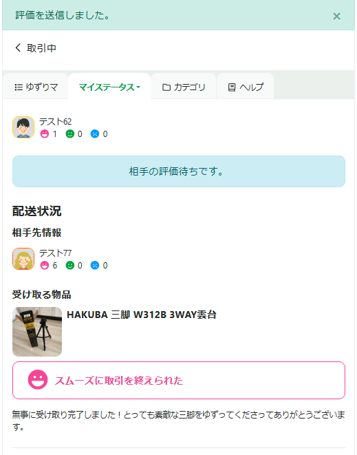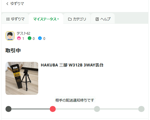 双方の配送情報の登録を終えると、取引中のアイテムのステータスが「相手の発送通知待ちです」に変わります。