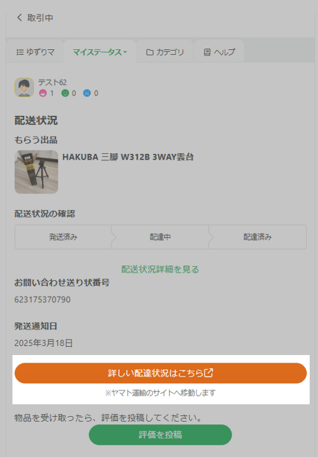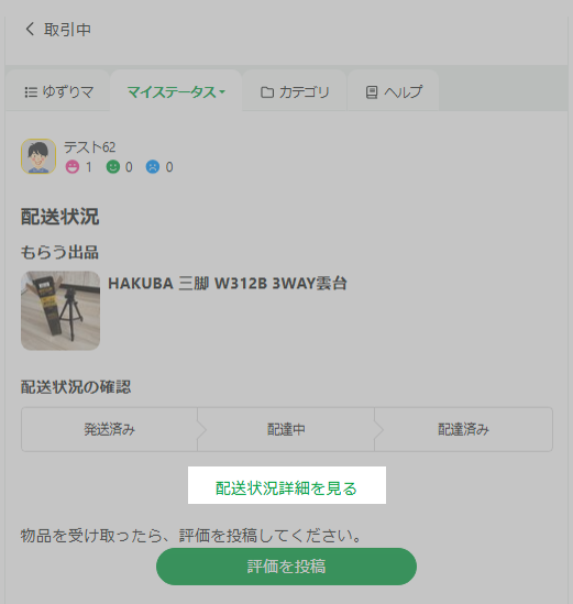 相手が発送をすると、取引中のアイテム画面から、現在の配送状況の確認を行うことができます。