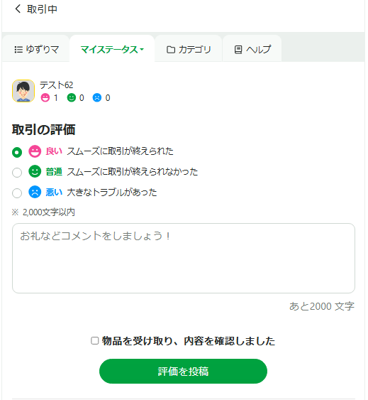 アイテムの配達が完了すると、アイテムのステータスが「受け取った物品を評価してください」に更新されます。