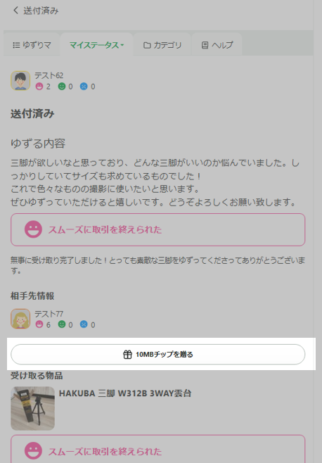取引相手からの評価が完了すると「チップを贈る」ボタンが表示されチップを贈ることが可能になります。