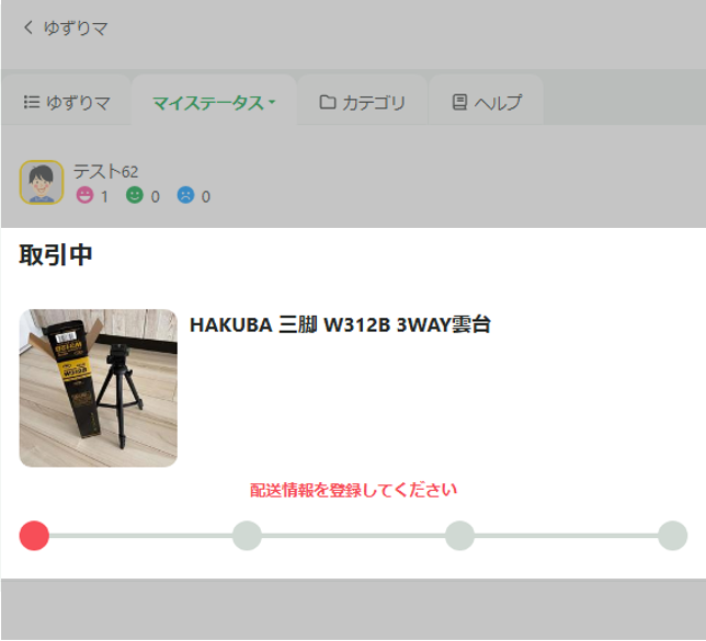 物品取引が成立すると、「マイステータス」>「取引中」ページに取引が成立したアイテムが表示されます。ここでは、取引中のアイテムのステータスを確認できます。